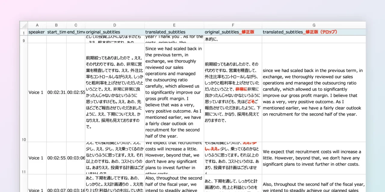 ひと昔前よりはずっとAI翻訳の精度は上がりましたが、AIがすべてこちらの思った通りに認識し、翻訳してくれるとは限りません。そのため、AIによる翻訳が上がったら内容確認と細かな調整をすることが、質の高い翻訳動画をつくるポイントです。
