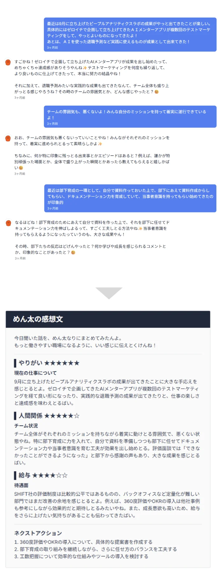 「元気にしとる?最近はどんな感じや?」といった自然な問いかけに対して、従業員は気軽に口語で応答するだけ。わずか10分ほどの対話で、その場で会話の要約とネクストアクションの提案が表示されます。従業員は対話を通じて自分の思考を整理し、リアルタイムでアドバイスを受けることができます。