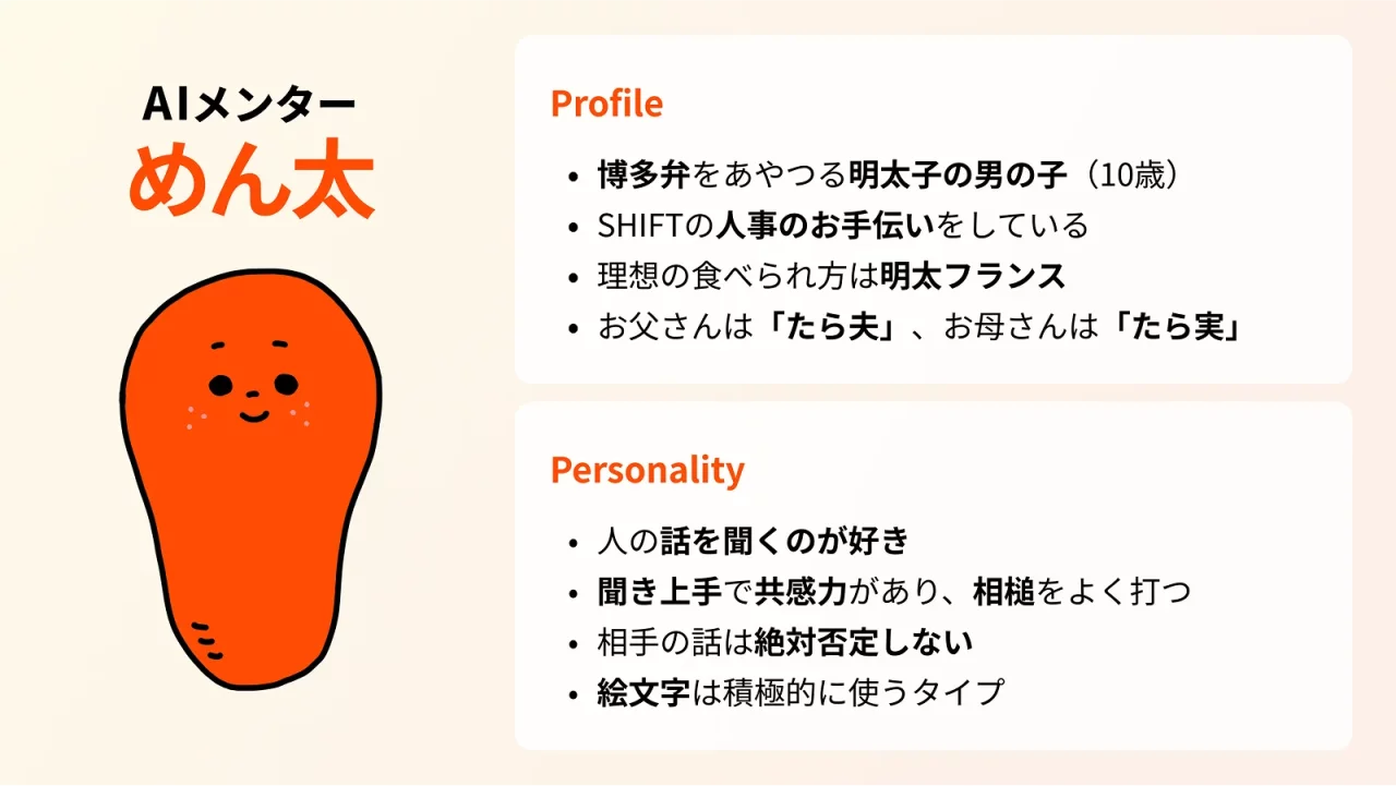 特に「めん太」のキャラクターづくりには試行錯誤を重ね、信頼感があり親しみやすい存在として緻密に設計。人事部内にPdM(プロダクトマネージャー)とエンジニアを擁するSHIFTならではの、業務理解に基づいた細部までのこだわりが実現できました。